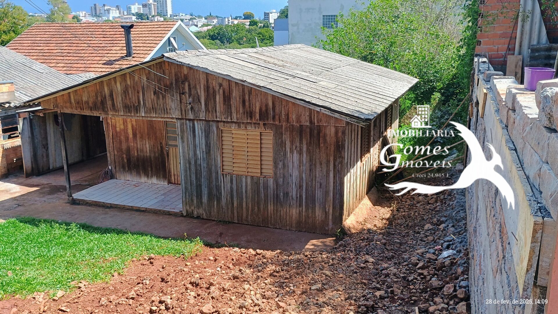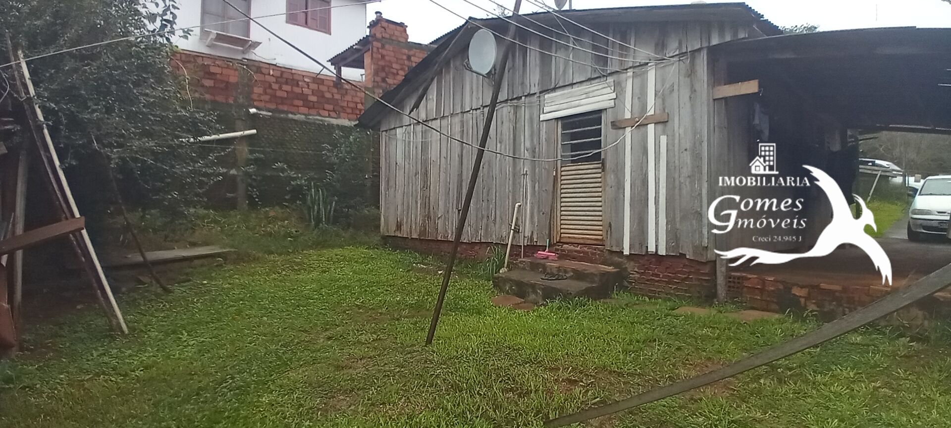 Terreno com casa de madeira. Com 2 dormitórios, banheiro, sala, cozinha, área na frente e garagem.